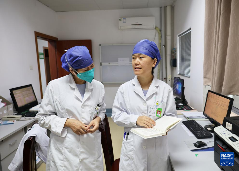 11月21日,在南宁市第四人民医院感染科一病区,赵蕊(右)与同事沟通病人病情。