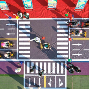 12月1日,在山东省临沂市沂南县双堠镇中心幼儿园,孩子们通过趣味游戏的方式学习交通知识(无人机照片)。