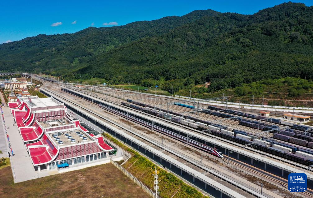12月3日,由老挝入境的一列“澜沧号”列车停靠在中老铁路磨憨站(无人机照片)。