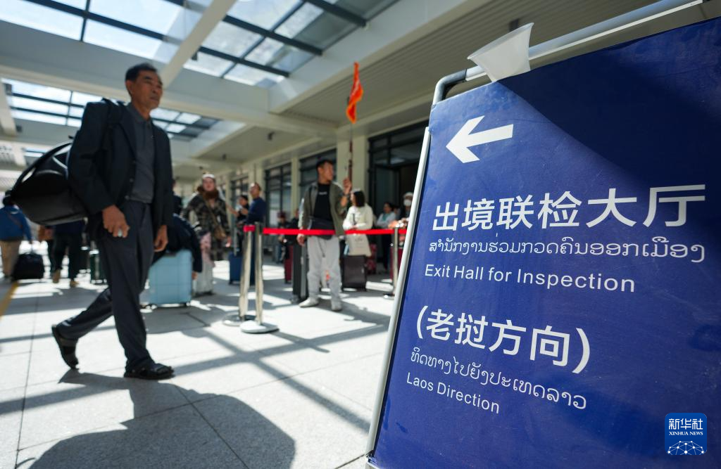 这是12月3日在中老铁路磨憨站拍摄的去往老挝方向的出境联检大厅指示牌。