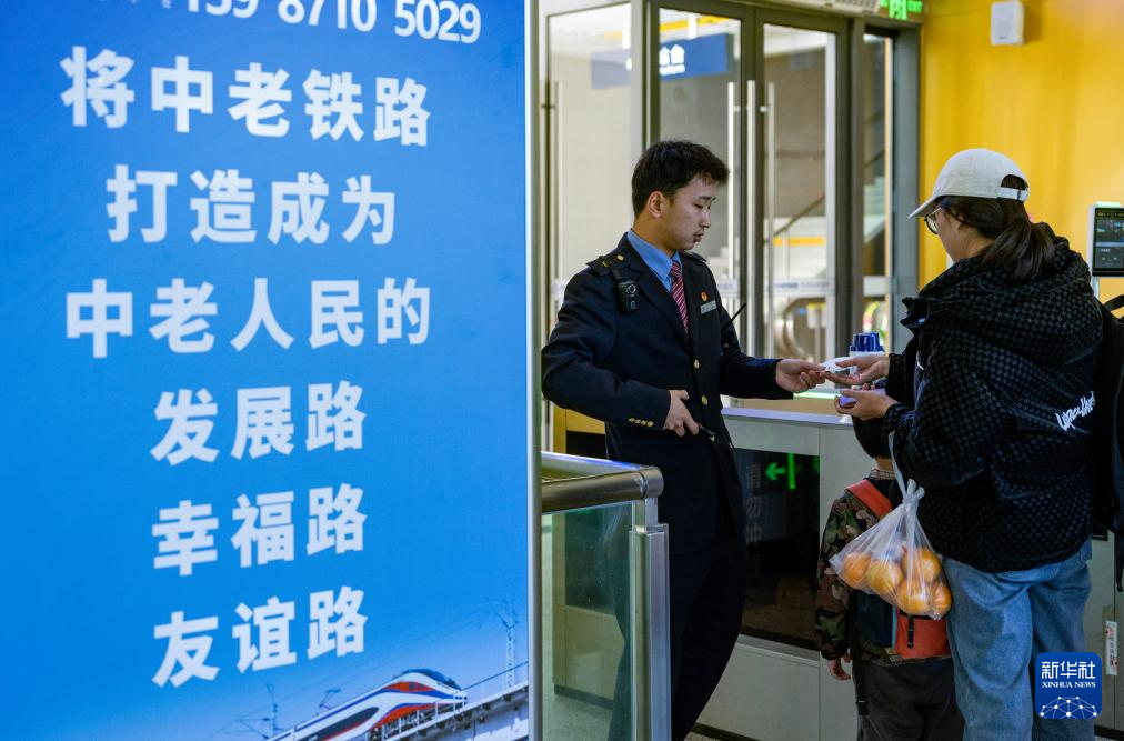 12月1日,中老铁路化念站工作人员在为旅客检票。
