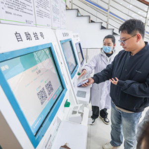 12月3日,安华镇中心卫生院的医务人员在指导患者用自助挂号机挂号。