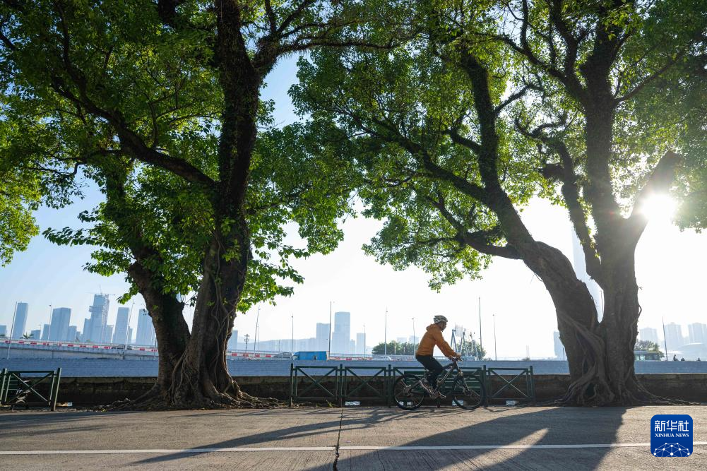 12月2日,市民在澳门西湾湖景大马路骑单车。