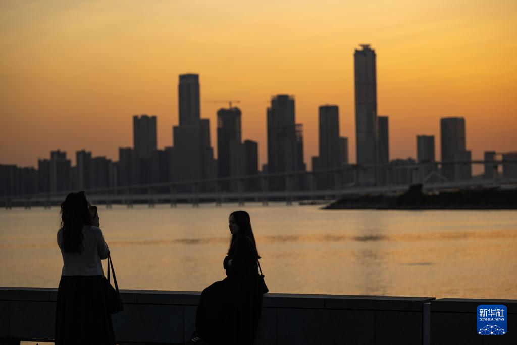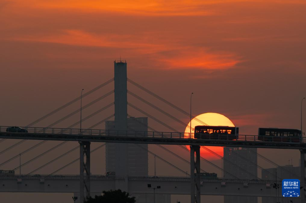 11月30日,市民在澳门科学馆旁观看日落,远处是横琴半岛。