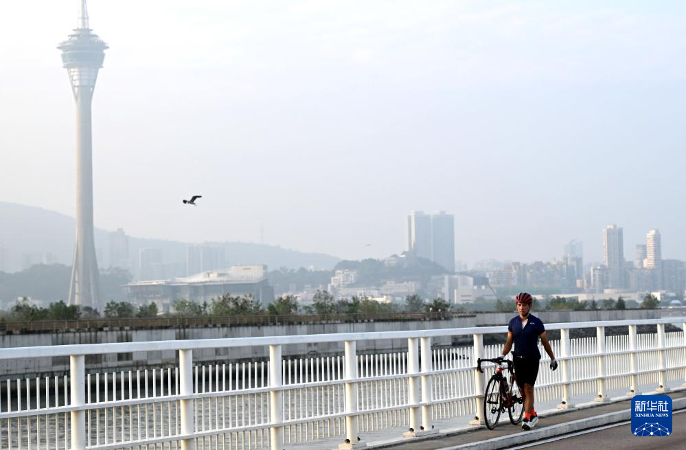 市民推着自行车行走在澳门嘉乐庇总督大桥上(11月17日摄)。
