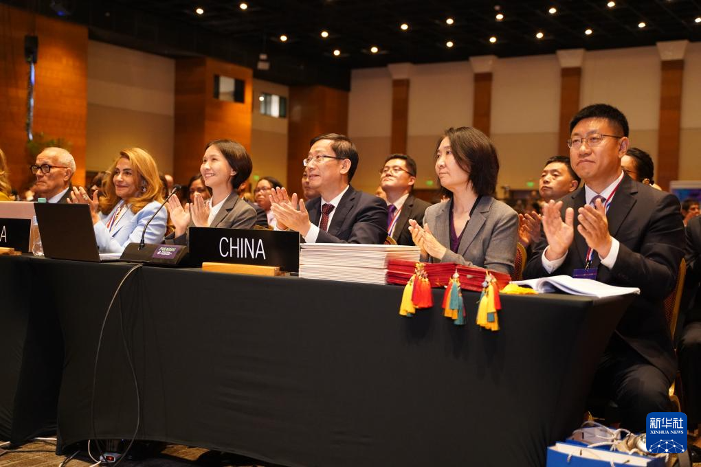 12月4日,在巴拉圭亚松森拍摄的联合国教科文组织保护非物质文化遗产政府间委员会第19届常会评审现场,中国代表团庆祝春节申遗成功。