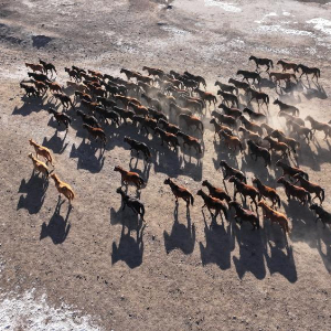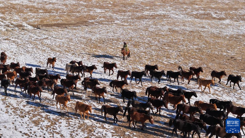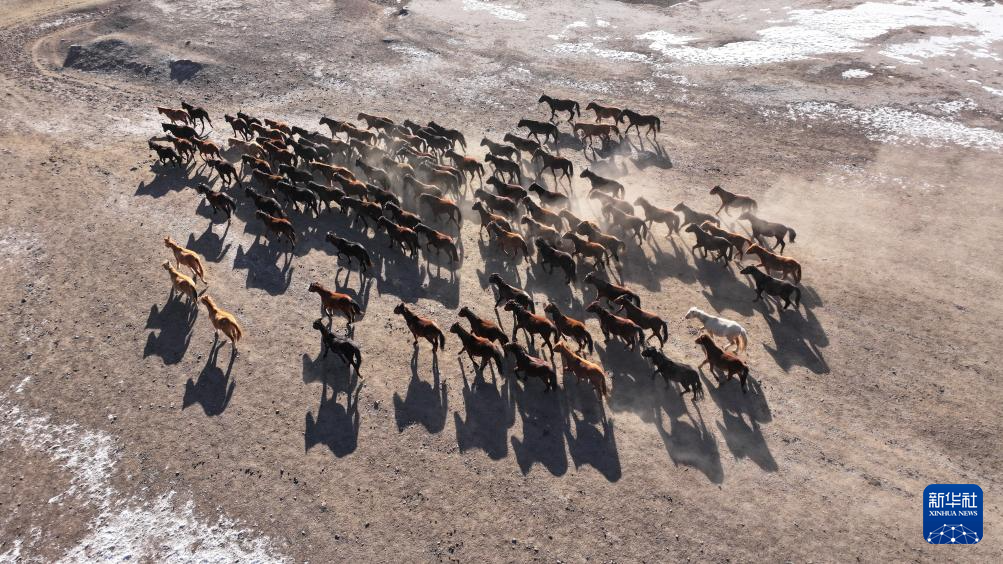 12月4日,在甘肃山丹马场一场,马群有序从天然草场转场至茬地(无人机照片)。