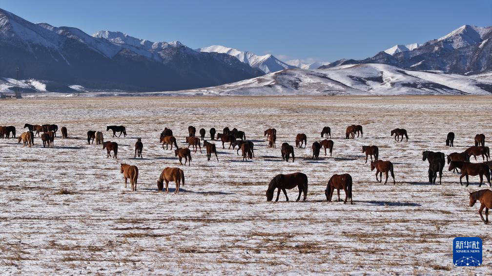 12月4日,在甘肃山丹马场一场,马群在茬地觅食(无人机照片)。
