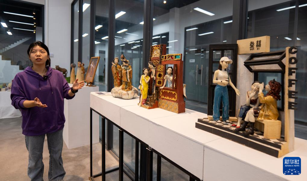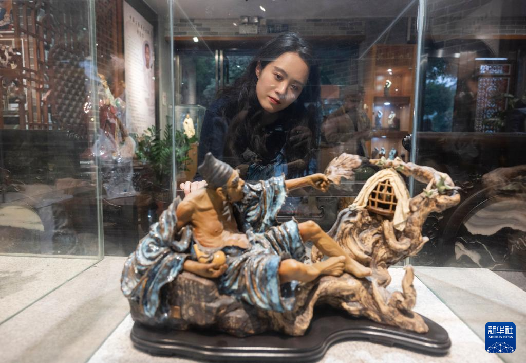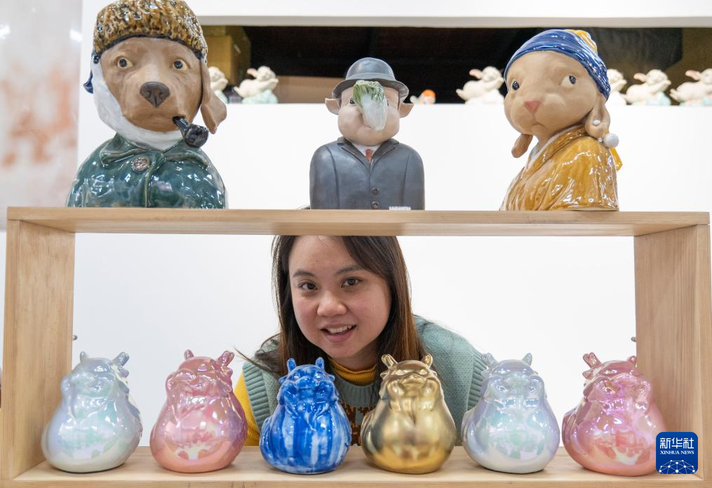 12月3日,在广东省佛山市美陶湾酉物工作室,佛山市陶瓷艺术大师、工艺美术师伍蔚蔚介绍具有现代创意元素的陶塑作品。