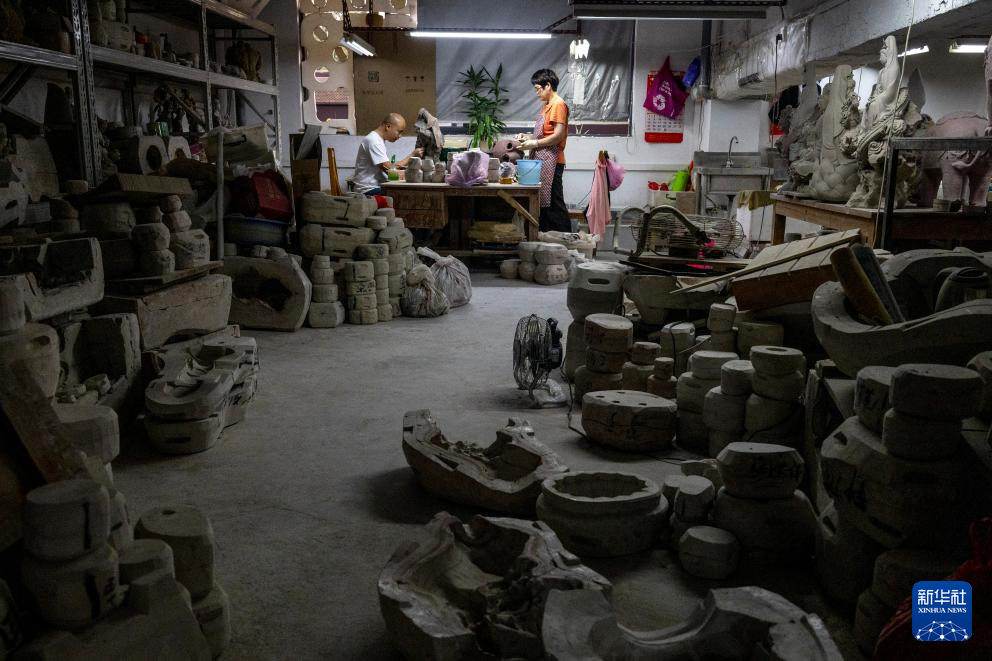 12月3日,在广东省佛山市美陶湾冯志伟陶塑设计室,一名工匠在打磨修坯。
