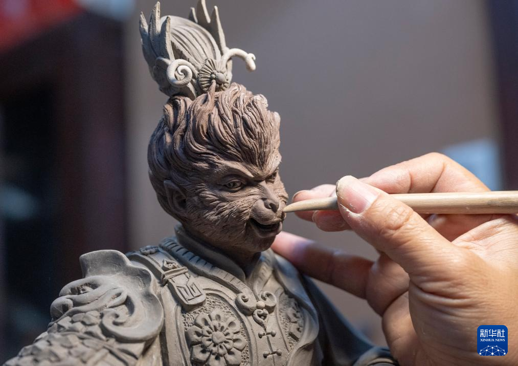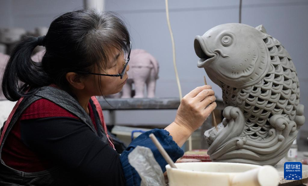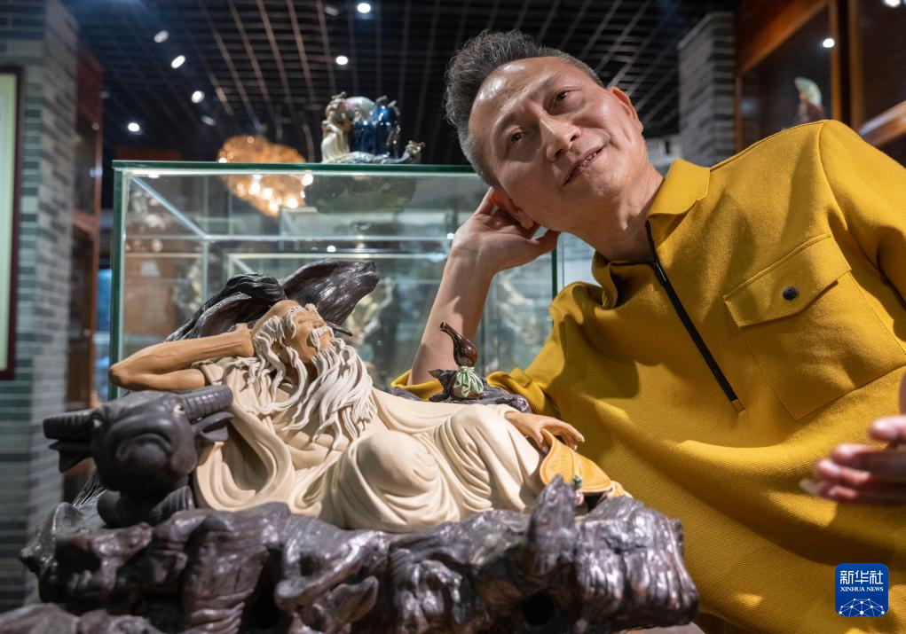 12月3日,在广东省佛山市美陶湾酉物工作室,工艺美术师黄炜介绍具有现代创意元素的陶塑作品。