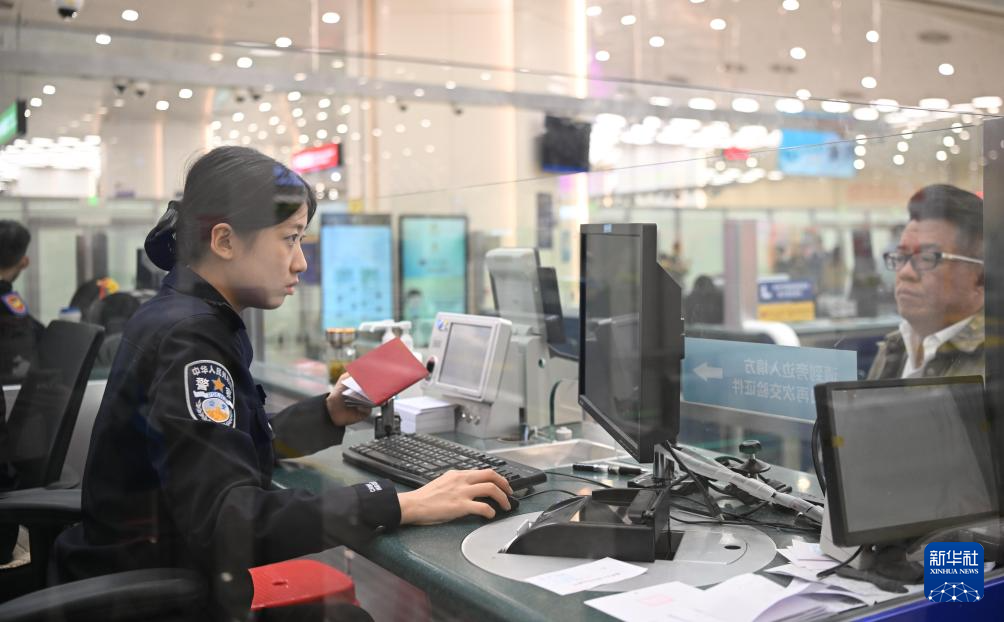 在横琴口岸,边检站执勤民警在验放出入境旅客(11月25日摄)。
