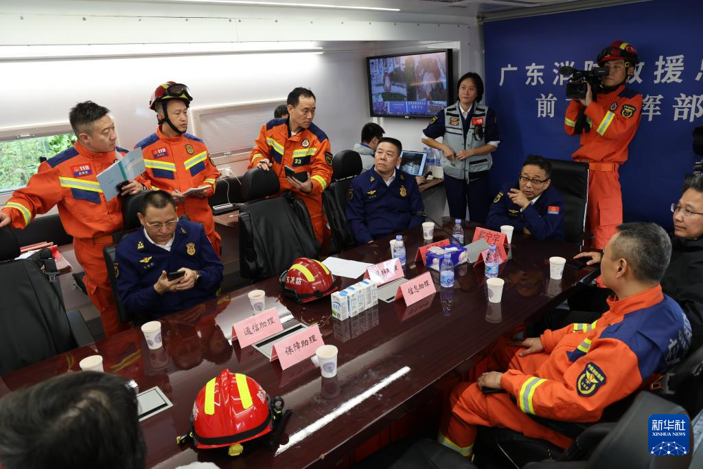 12月5日,在深圳市宝安区航城街道洲石路,消防救援人员在前方指挥部讨论现场情况。
