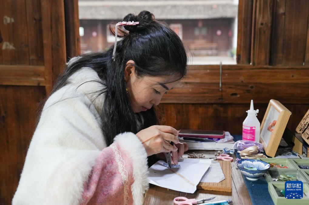 12月4日,手工艺人在鄞州非遗馆内展示骨木镶嵌技艺。