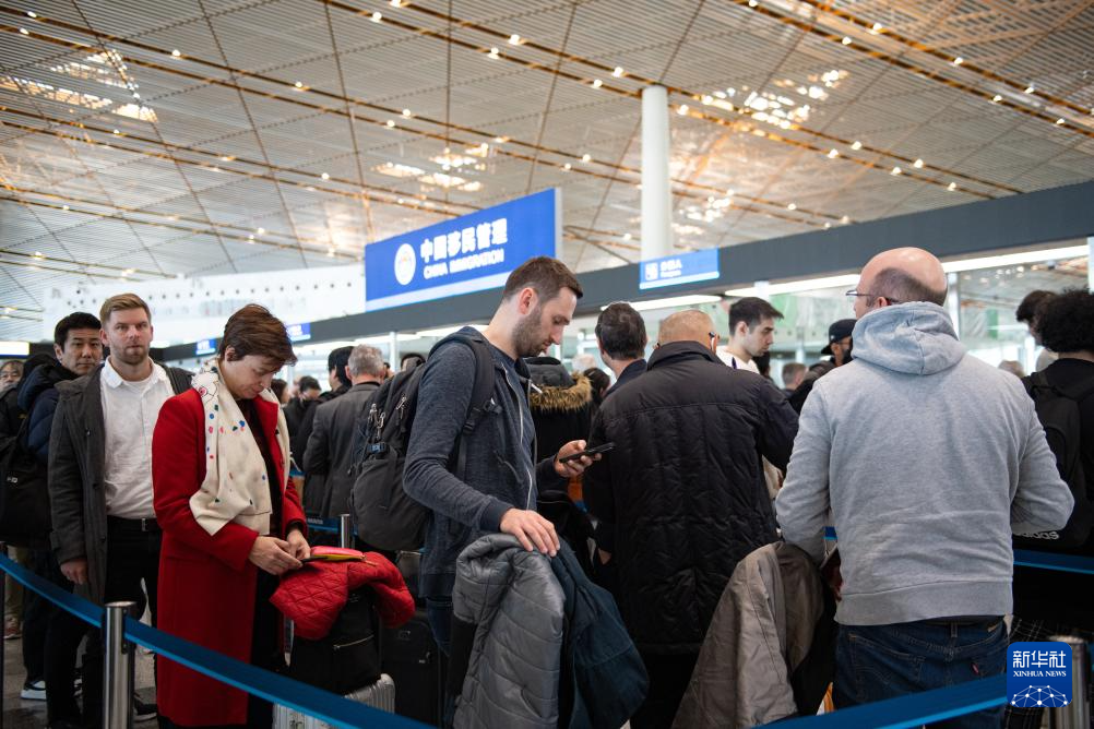 12月4日,外国游客在北京首都机场三号航站楼边检入境现场候检。