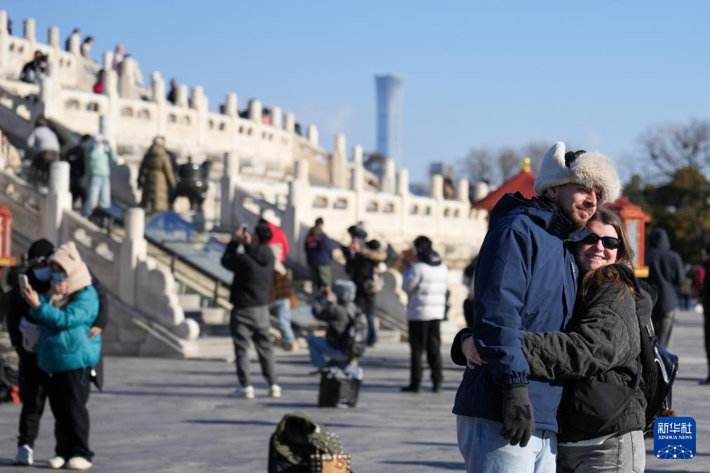 12月5日,两名外国游客在北京天坛公园合影。