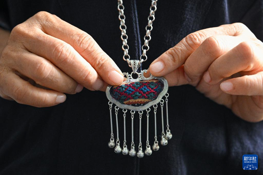 黎族织娘在位于海南省东方市东河镇的家中展示含有黎锦元素的吊坠(2023年6月7日摄)。