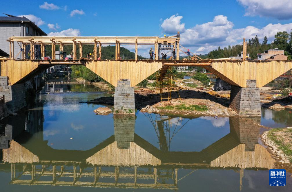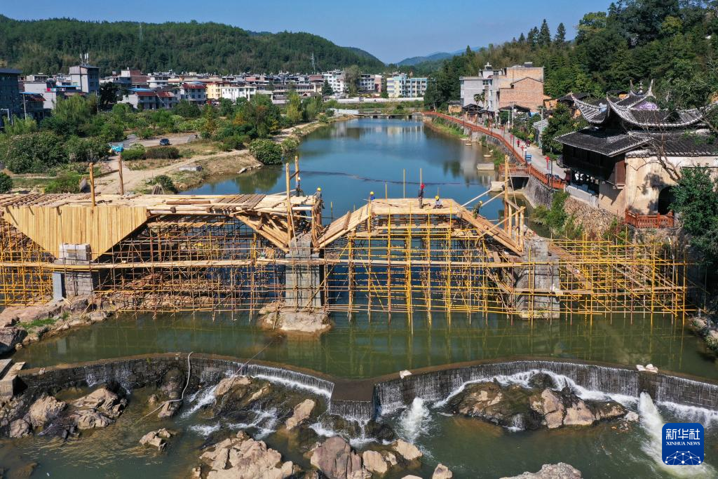 在福建省屏南县长桥镇,工匠在修复万安桥时搭建廊桥桥台拱架(2023年10月18日摄,无人机照片)。