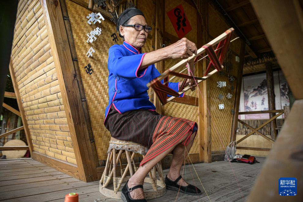 黎族老人在位于海南保亭的槟榔谷文化旅游区展示黎族织锦过程中的绕线工艺(2024年11月4日摄)。