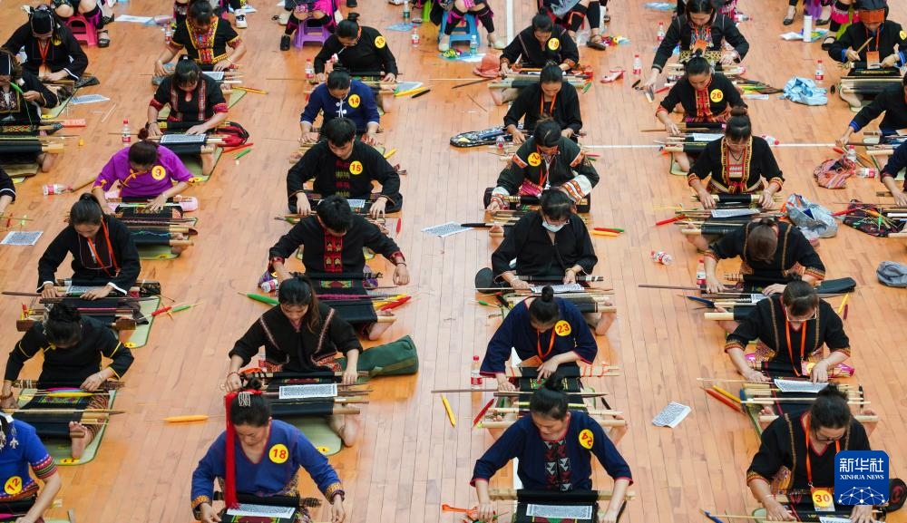 在海南省乐东黎族自治县,选手们在技艺比赛现场编织黎锦(2023年4月23日摄)。