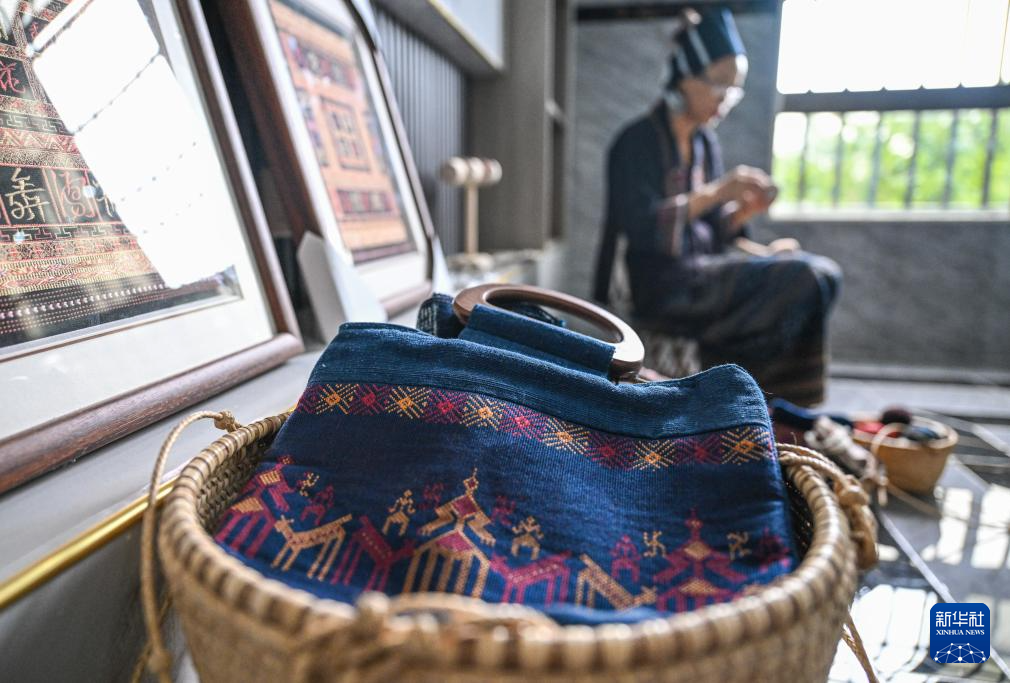 这是在海南省东方市东河镇拍摄的黎族传统纺染织绣技艺省级传承人符永英用黎锦制作的手袋(2023年6月7日摄)。