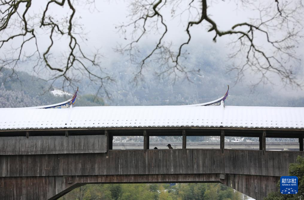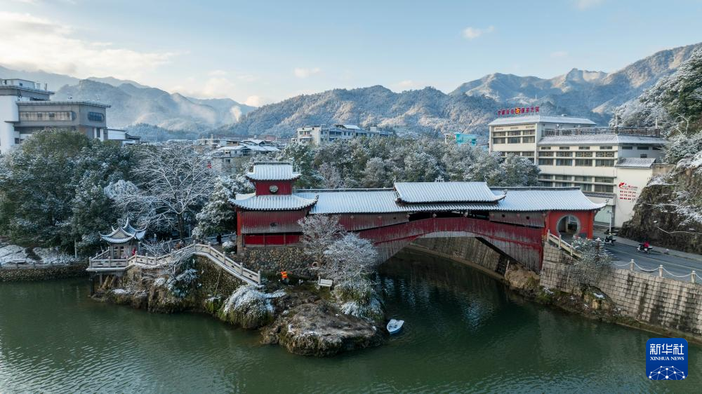 这是在浙江省丽水市庆元县拍摄的古廊桥咏归桥雪后景色(2024年1月23日摄,无人机照片)。
