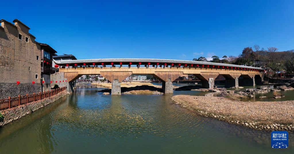 这是在福建省屏南县长桥镇拍摄的万安桥(2024年1月23日摄,无人机拼接照片)。
