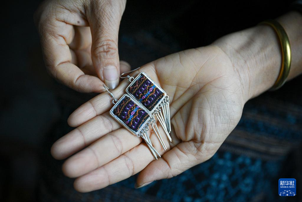 黎族织娘在位于海南省东方市东河镇的家中展示含有黎锦元素的耳坠(2023年6月7日摄)。