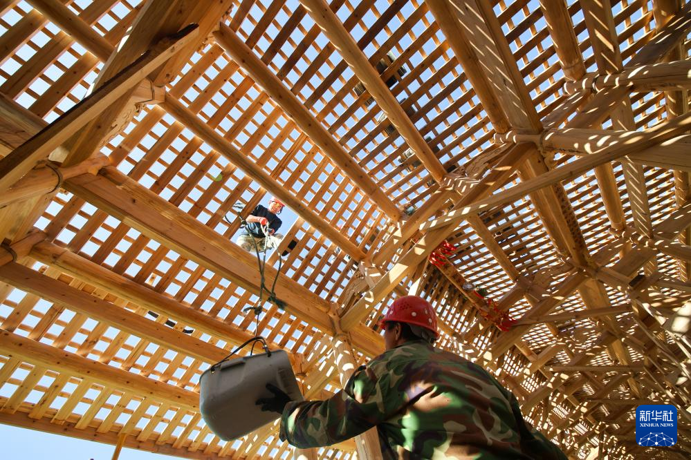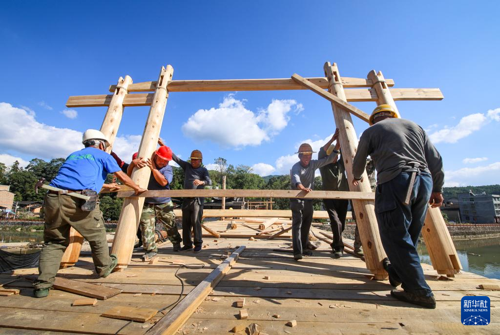 在福建省屏南县长桥镇,工匠们在修复万安桥时竖起廊屋立柱(2023年11月2日摄)。