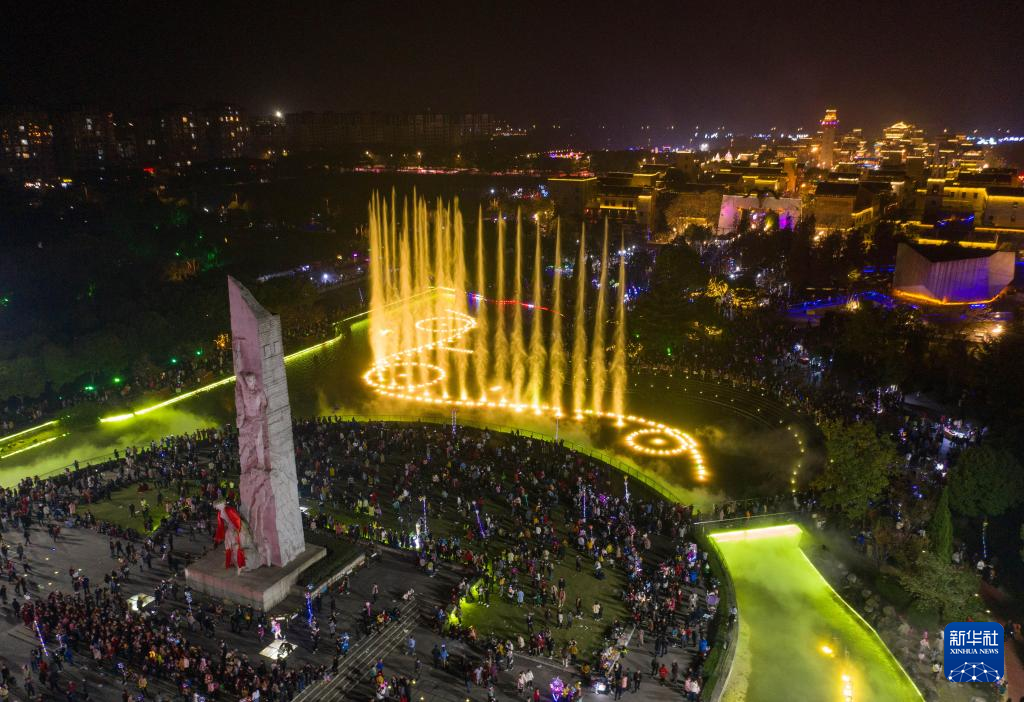 在四川省北川羌族自治县新生广场,当地群众在羌历新年期间观赏音乐喷泉(2020年11月14日摄,无人机照片)。