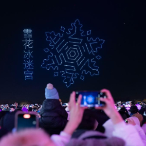 12月6日晚,松花江哈尔滨段上空上演无人机光影秀,为即将到来的第五届哈尔滨采冰节和第二十六届哈尔滨冰雪大世界预热,吸引众多市民和游客前来观看。