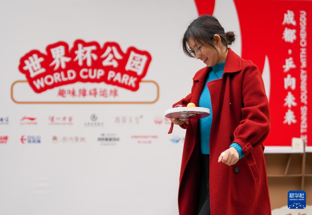 12月7日,在成都市武侯区玉林东路“世界杯公园”,市民参与乒乓球互动游戏。
