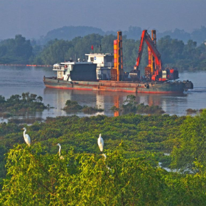 初冬时节,广西钦州平陆运河航道疏浚作业区及岸边,大群白鹭觅食、栖息。白鹭和航道疏浚作业现场形成一幅和谐画面。