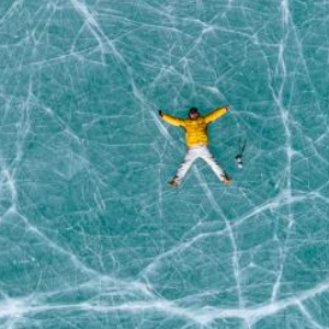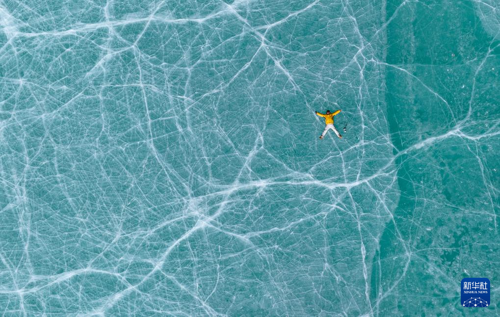 12月7日,一名游客躺在琼穆岗嘎峰前的冰湖上拍照(无人机照片)。