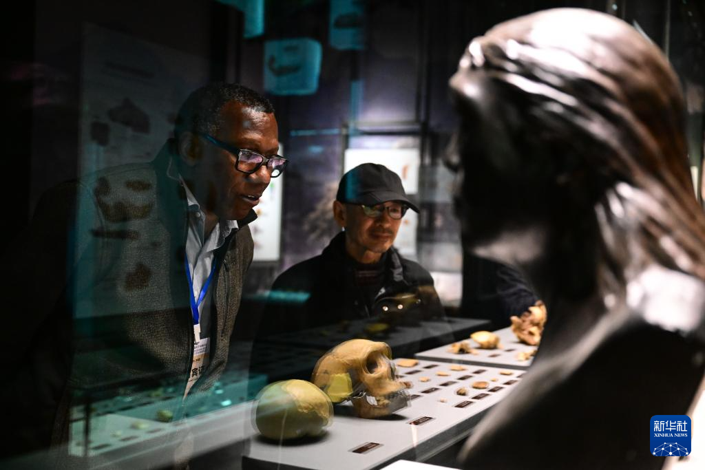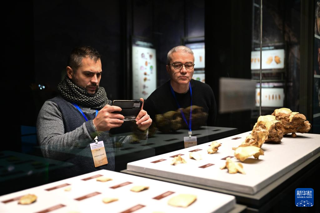 12月6日,在安徽省池州市东至县,参与2024华龙洞遗址学术研讨会的国外专家学者在华龙洞遗址陈列馆参观。
