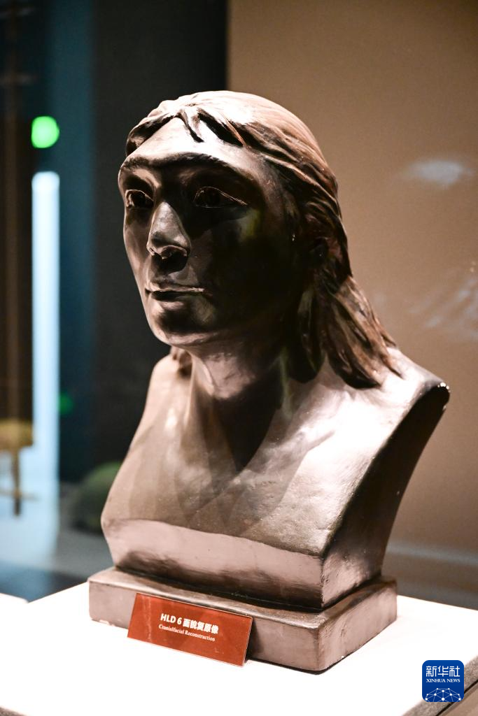 这是12月6日在位于安徽省池州市东至县的华龙洞遗址陈列馆拍摄的华龙洞6号头骨面貌复原像。