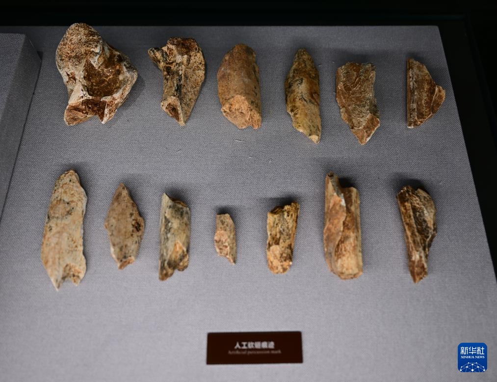 这是12月6日在位于安徽省池州市东至县的华龙洞遗址陈列馆拍摄的华龙洞遗址出土动物骨片,骨片上有人工砍砸痕迹。