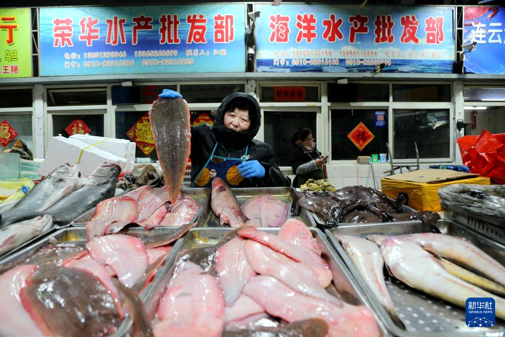 12月9日,商户在江苏省连云港市连云区海棠路市场整理上柜销售的海产品。