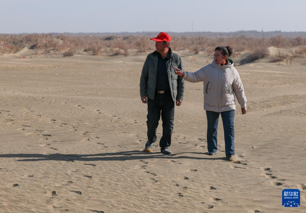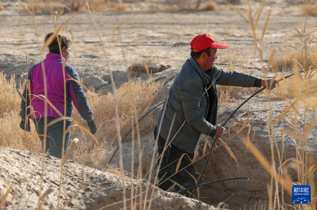 麦麦提和妻子在承包的沙地里检查滴灌带铺设情况(12月4日摄)。