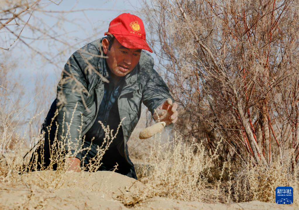麦麦提在承包的沙地里挖大芸(12月4日摄)。
