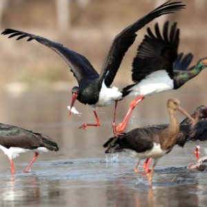 12月9日,黑鹳在河北省石家庄市平山县境内的冶河湿地嬉戏觅食。