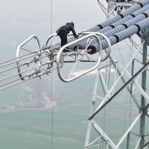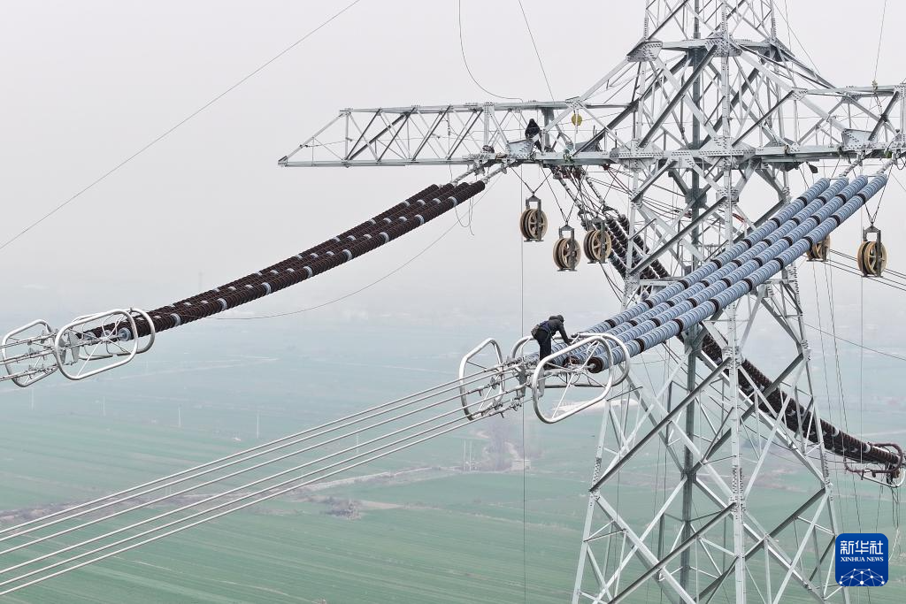 12月10日,工人在河北省磁县境内的陇东至山东800千伏特高压直流线路工程建设工地安装附件(无人机照片)。