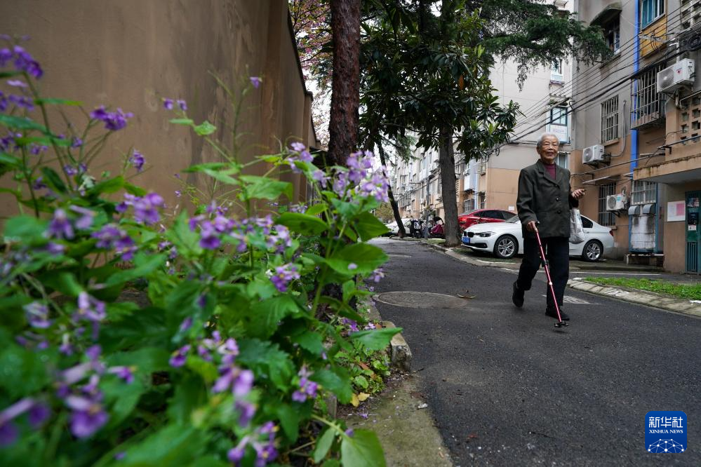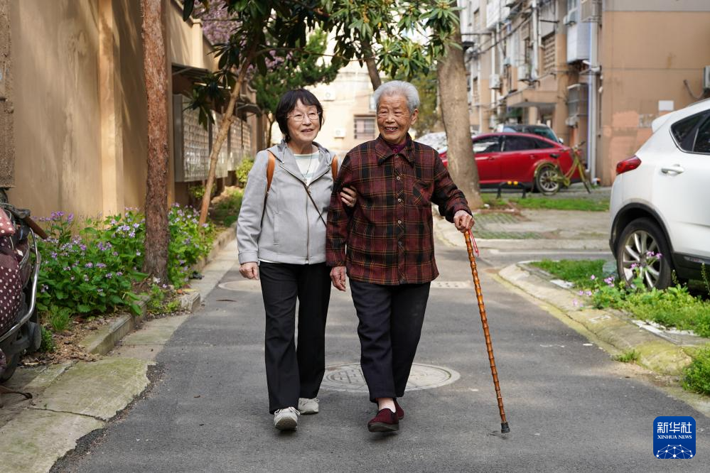 日本铭心会会长松冈环在南京看望艾义英(右)时与她在社区内散步聊天(2024年4月5日摄)。