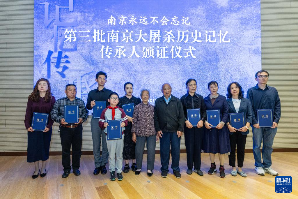 第三批南京大屠杀历史记忆传承人与南京大屠杀幸存者艾义英(左六)、刘民生(左七)合影(2024年10月11日摄)。当日,第三批南京大屠杀历史记忆传承人颁证仪式在侵华日军南京大屠杀遇难同胞纪念馆举行。这9名传承人来自8个幸存者家庭,年龄最大的68岁,最小的9岁。