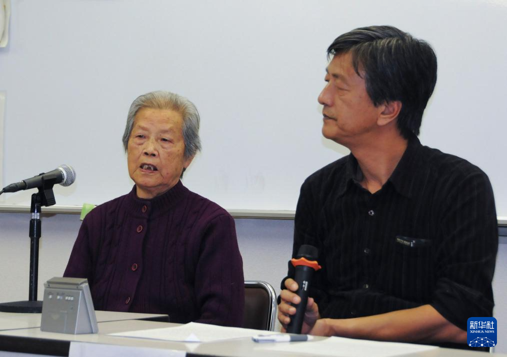 艾义英(左)在日本大阪参加证言集会,讲述自己在南京大屠杀中的亲身经历(2014年12月7日摄)。