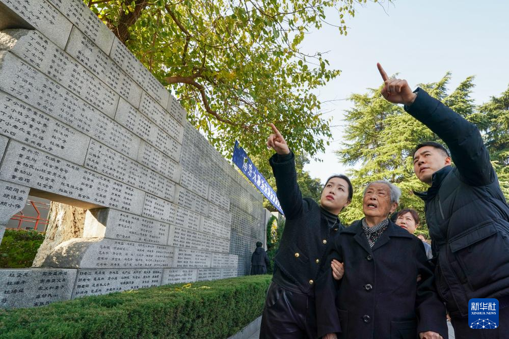 在南京大屠杀死难者家庭祭告活动中,艾义英(右二)和家人在侵华日军南京大屠杀遇难同胞纪念馆的“哭墙”上寻找家人姓名(2024年12月1日摄)。