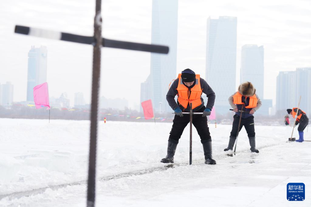 12月9日,工人在哈尔滨冰雪大世界采冰现场作业。