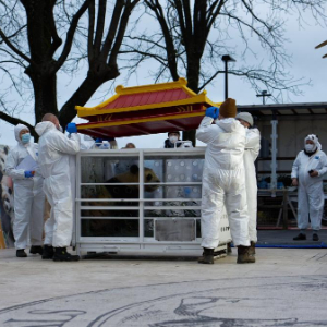 12月10日,在比利时布吕热莱特的天堂动物园,工作人员将大熊猫“天宝”安置在运输箱中。