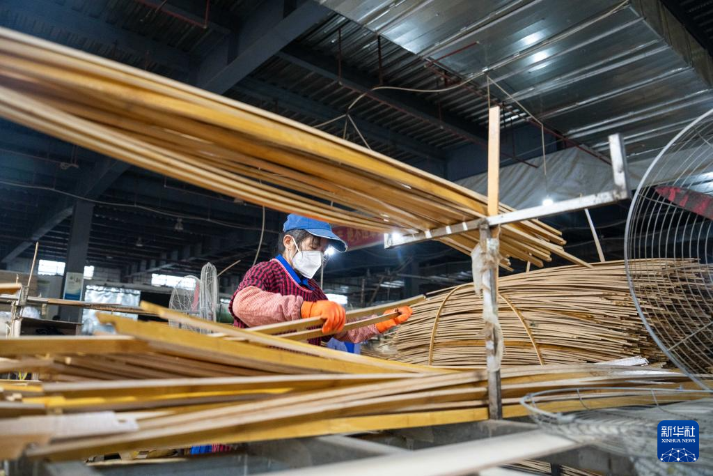 12月10日,在永州市双牌竹木产业科技园,湖南阳明竹咏科技有限公司的工人在加工竹条。