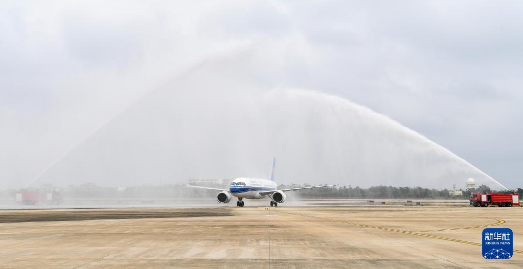 12月11日,由C919执飞的中国南航CZ6786航班在海口美兰国际机场通过水门。